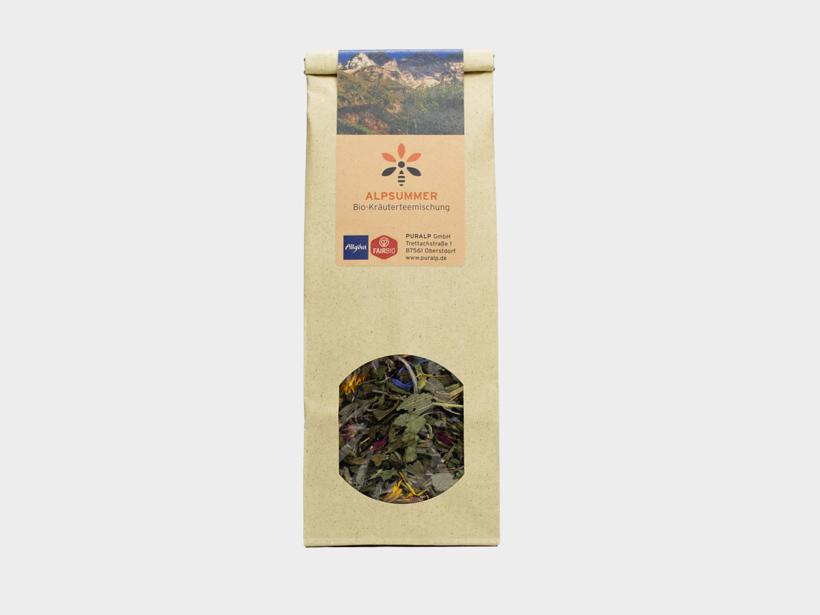 Die aromatischen Kräuter und bunten Blüten unseres „Alpsummer“ Bio-Kräutertees erinnern an den Duft artenreicher Allgäuer Alpsommerwiesen. Dieser vollmundige Kräuteraufguss mit feiner Drachenkopfmelisse, köstlicher Pfefferminze, würzigem Salbei und farbenreichem Blütenanteil ist eine harmonische Mischung für jede Tageszeit.